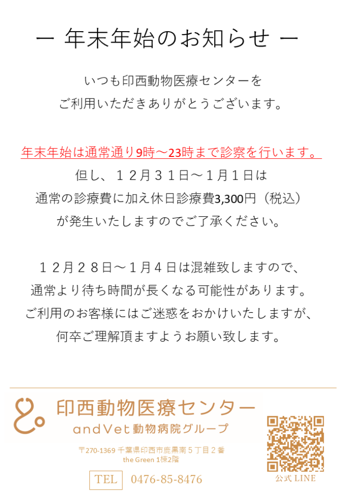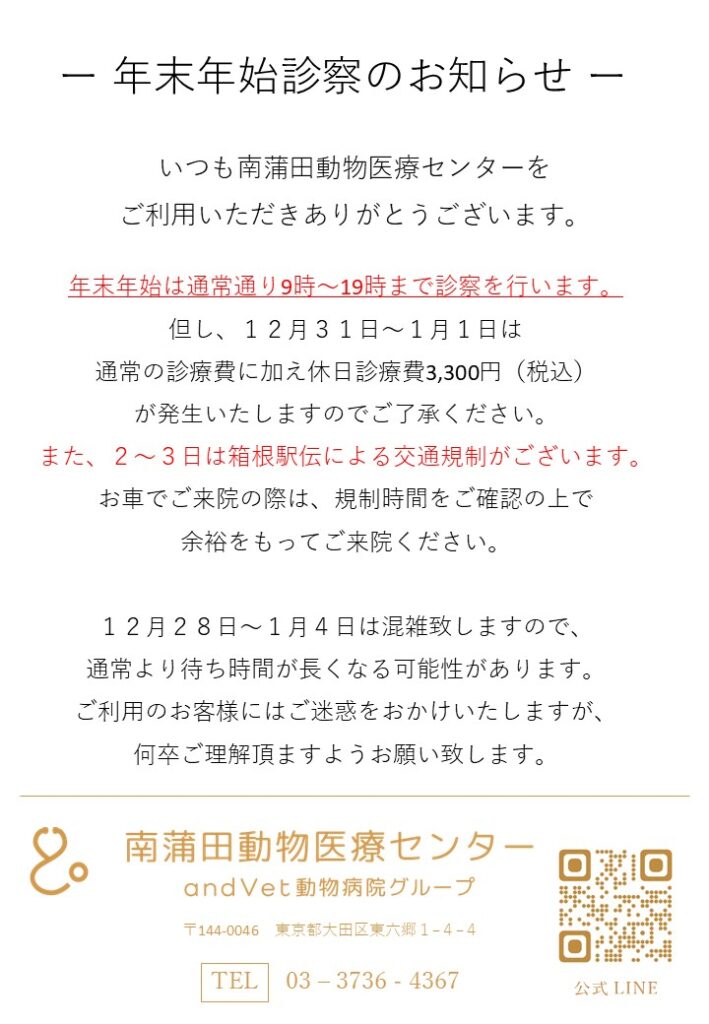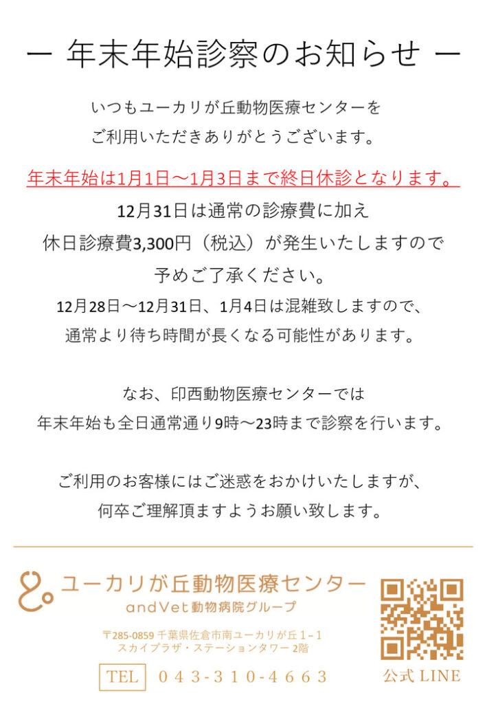 12⽉31⽇は通常の診療費に加え休⽇診療費3,300円(税込) が発⽣いたしますのでご了承ください。